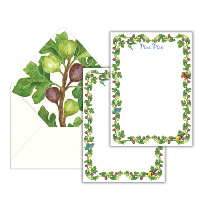 Personalized set of 25 fig and bird watercolor notecards with envelope liner.