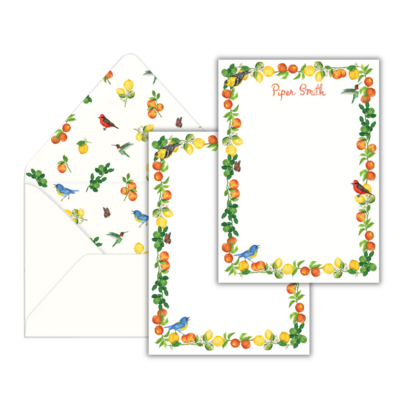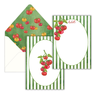 Personalized set of 25 tomato notecards with patterned envelope liner.