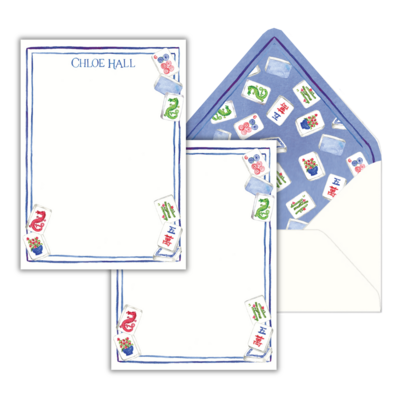Personalized set of 25 mahjong notecards with patterned envelope liner.